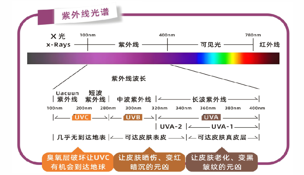 紫外線(Ultraviolet,UV)是電磁波譜中波長(zhǎng)介于可見光和 X 射線之間的部分,波長(zhǎng)范圍約為 10 納米(nm)至 400 納米。根據(jù)波長(zhǎng)范圍和物理特性,紫外線可分為多個(gè)波段,其中UVA、UVB、UVC是常見分類,而DUV(深紫外)、EUV(極紫外) 則屬于更短波長(zhǎng)的細(xì)分領(lǐng)域,在工業(yè)、科研等領(lǐng)域有特殊應(yīng)用。